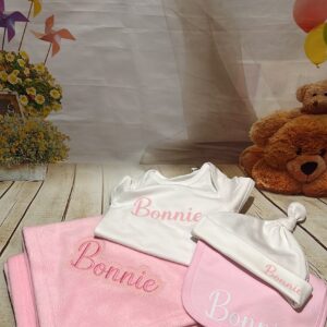 A lovely gift box consisting of a bib vest hat and a blanket all personalised