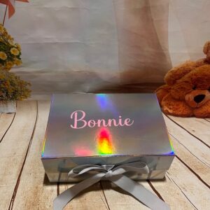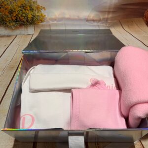 Delight new parents with this charming baby gift box, featuring a bib, vest, hat, and blanket – all beautifully personalised just for your little one. A perfect present for baby showers or newborn arrivals, available in white, pink, or blue. Please provide the baby’s name for customisation.