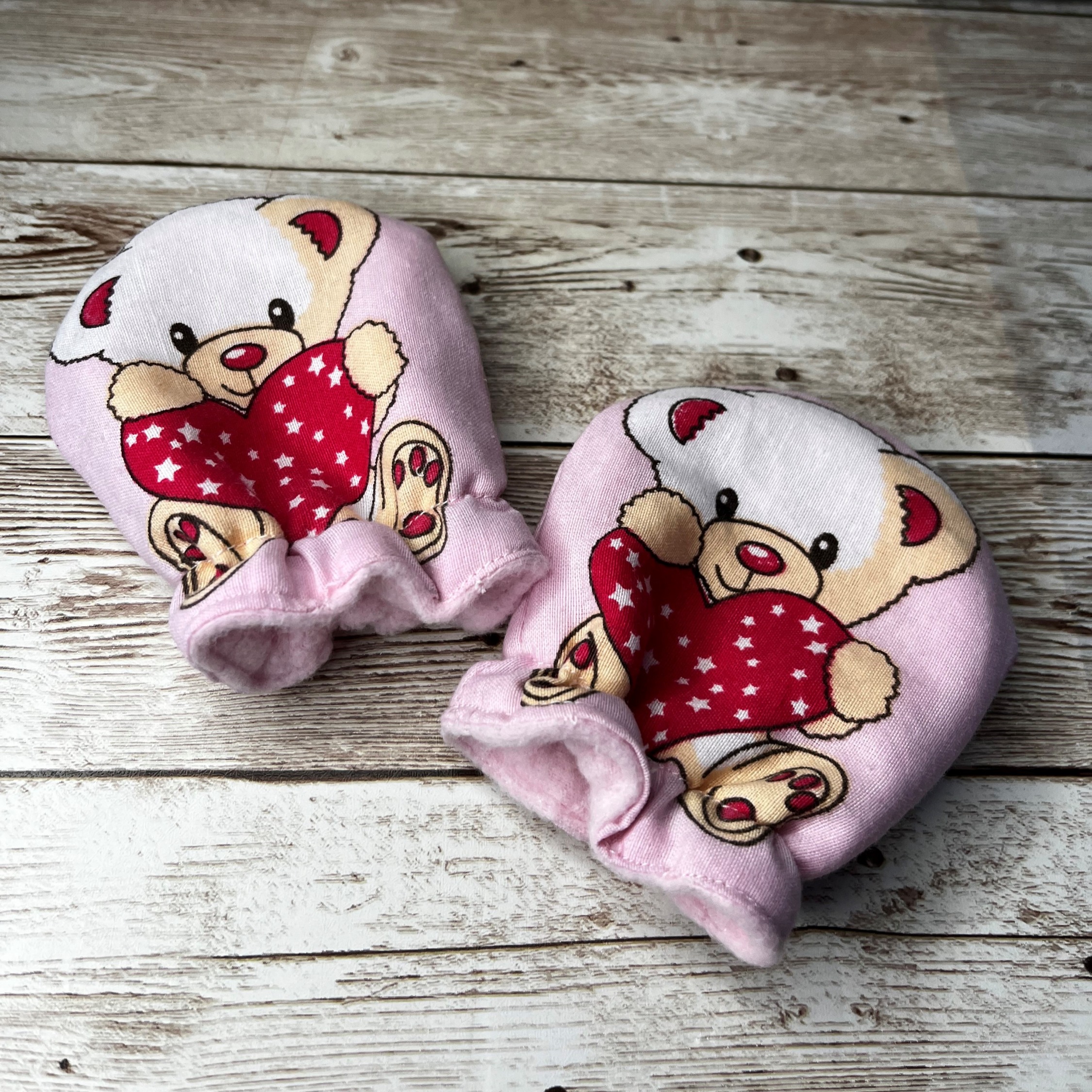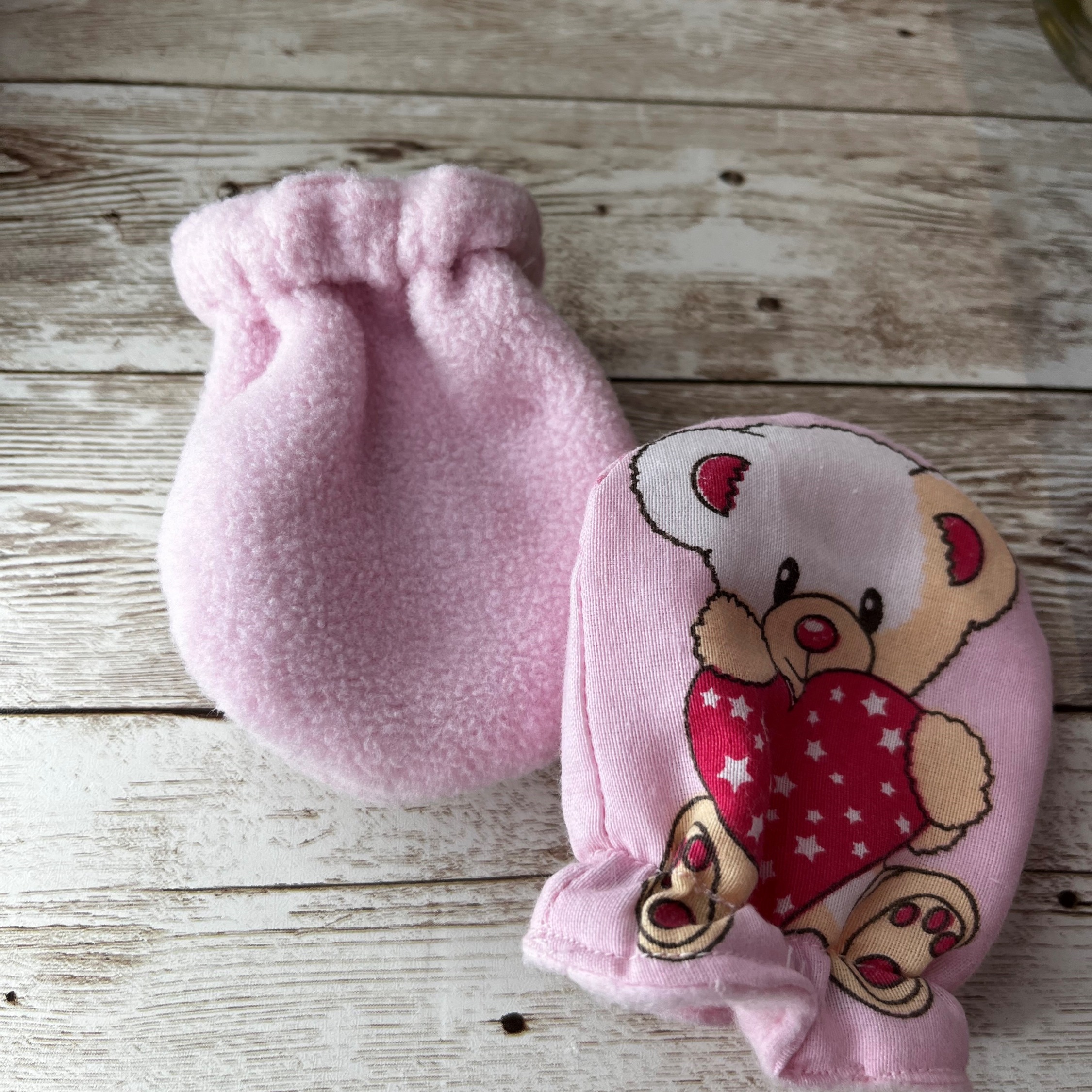 Handmade baby mittens with a fleece lining to keep tiny hands cosy. Can be reversed so that the fleece lining is on the outside.