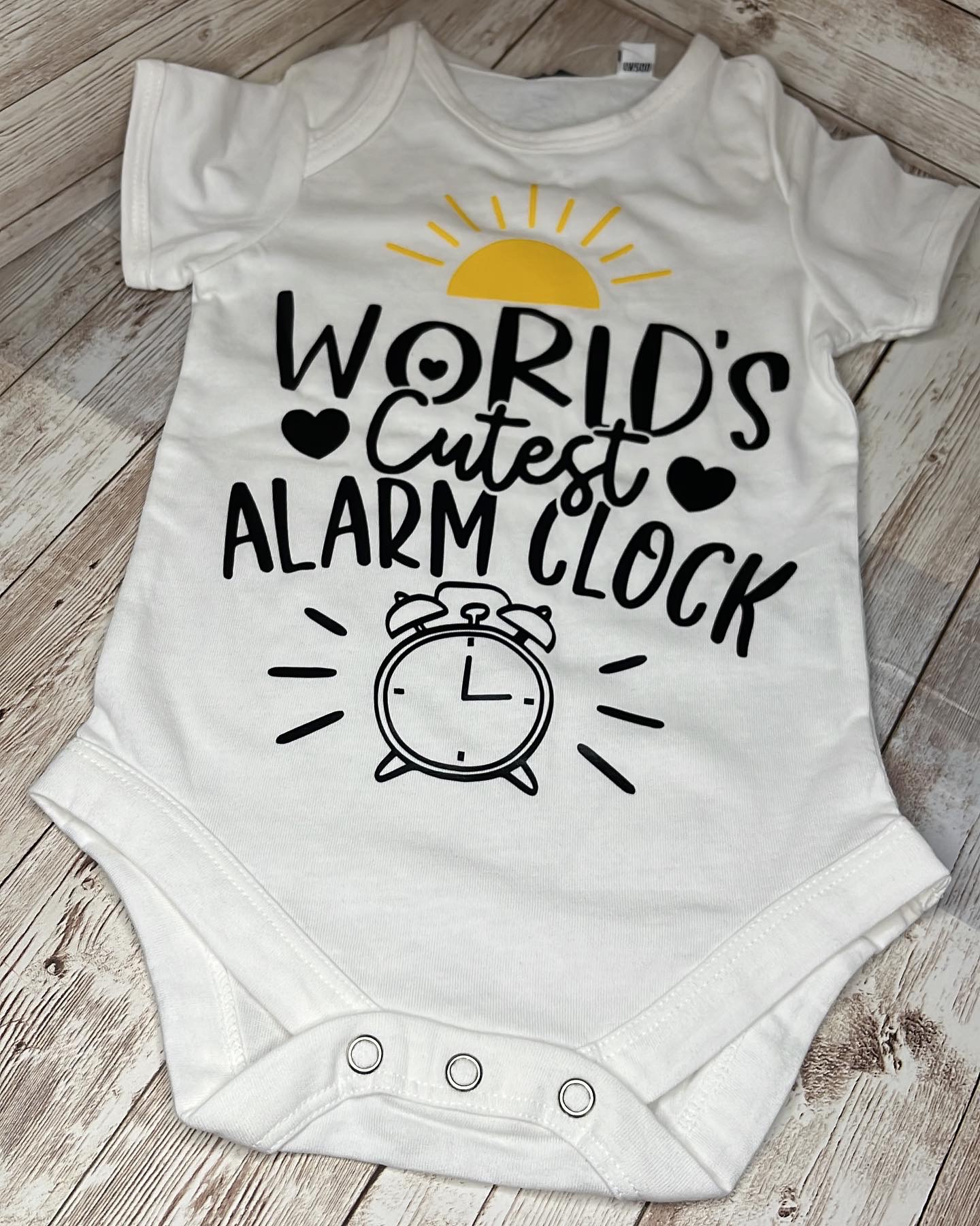 Baby vest with “worlds cutest alarm clock” design. Available in various sizes and colours